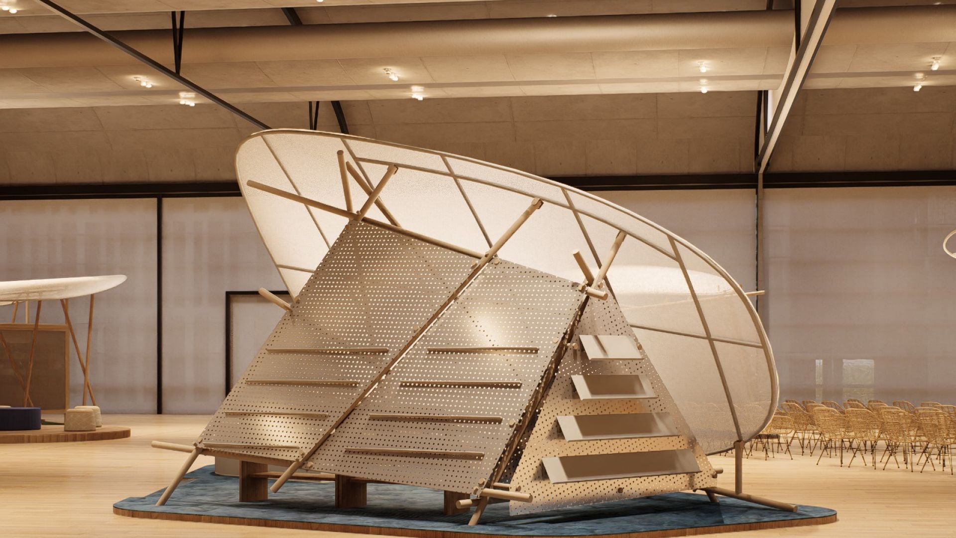 Curated by Patrick Flores and designed by Stanley Ruiz, the Pavilion highlights the integrity of Philippine materials and technologies, conversing with industrial elements, and the ingenuity to repurpose and refunction. The open communal space, with modular rattan and bamboo seating, offers visitors a flexible setting to explore 500 Philippine book titles on display. The translucent walls double as a canvas for works by Gary-Ross Pastrana, Mervin Malonzo, and seminal artist David Medalla.