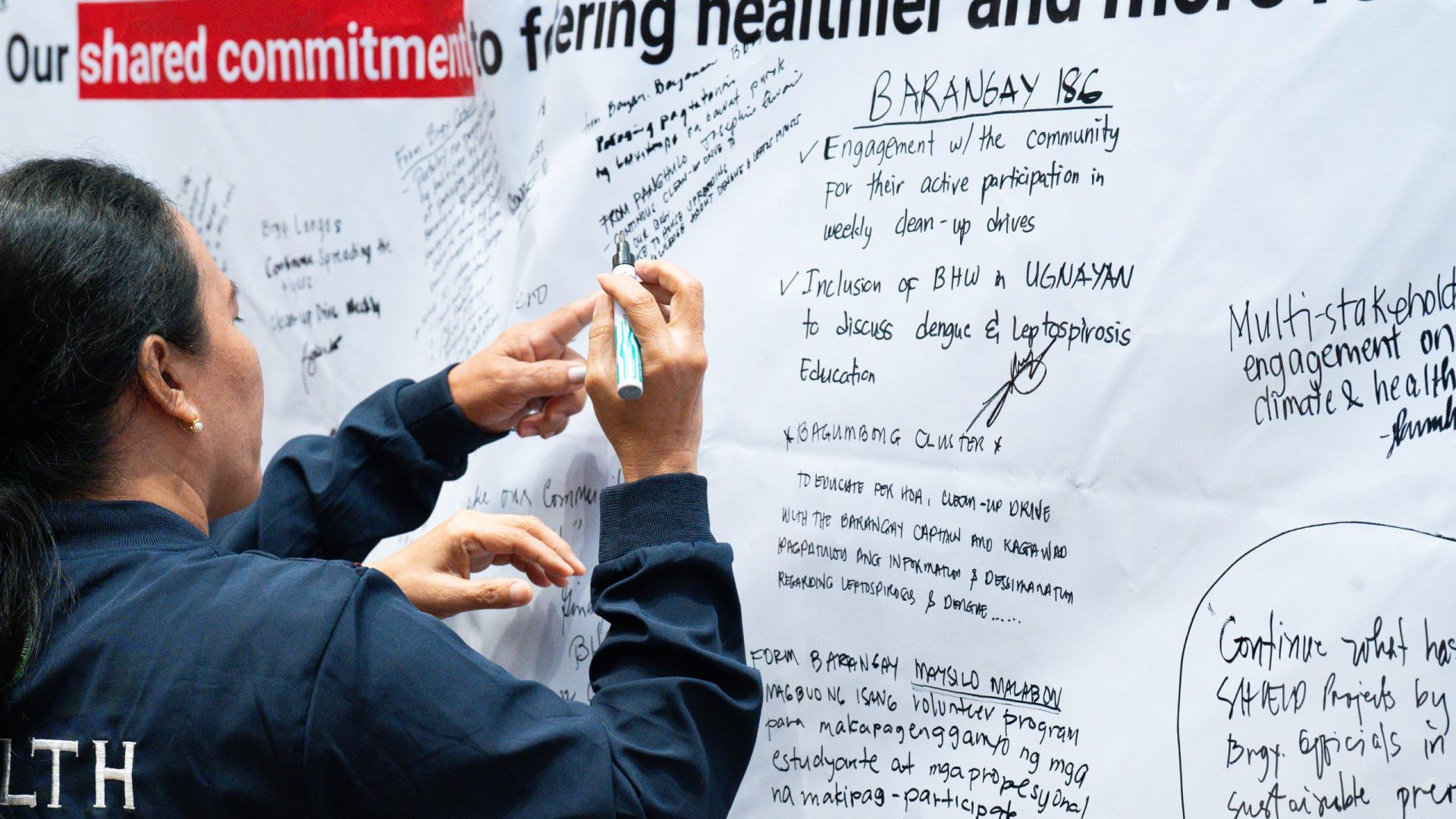 A barangay health worker signs the Pledge Wall at the SHIELD culminating event in support of dengue and leptospirosis prevention
