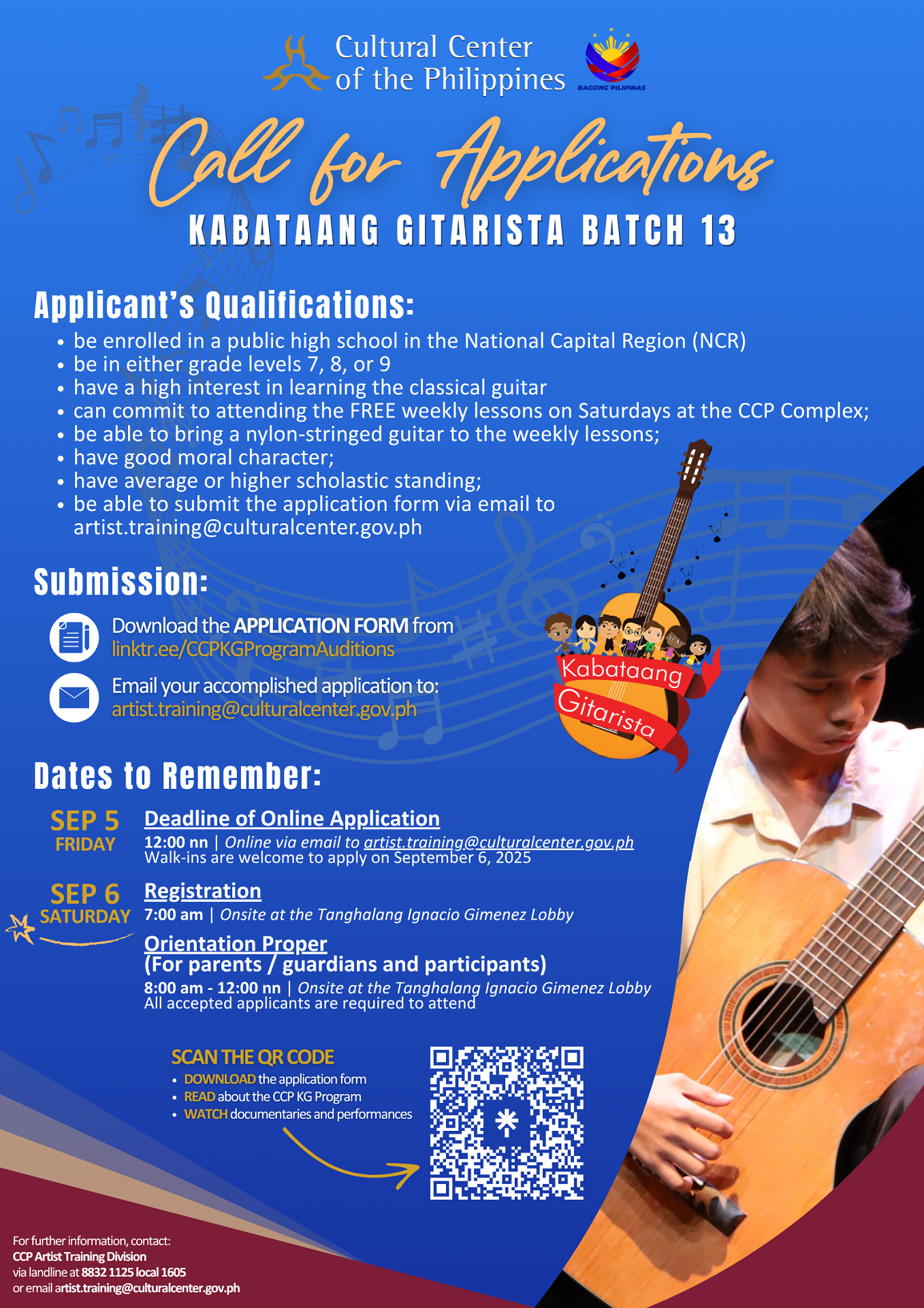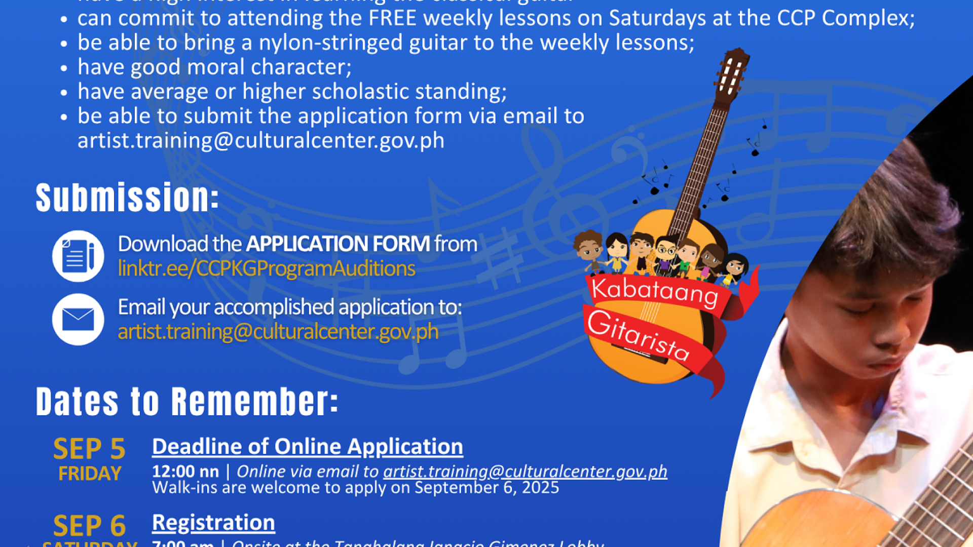 The Cultural Center of the Philippines (CCP) is now accepting applications for Batch 13 of the CCP Kabataang Gitarista (KG) Program, a project spearheaded by the Artist Training Division under the CCP Arts Education Department. The CCP KG Program provides classical guitar training and performing opportunities for aspiring guitarists while developing an increased appreciation for classical guitar.