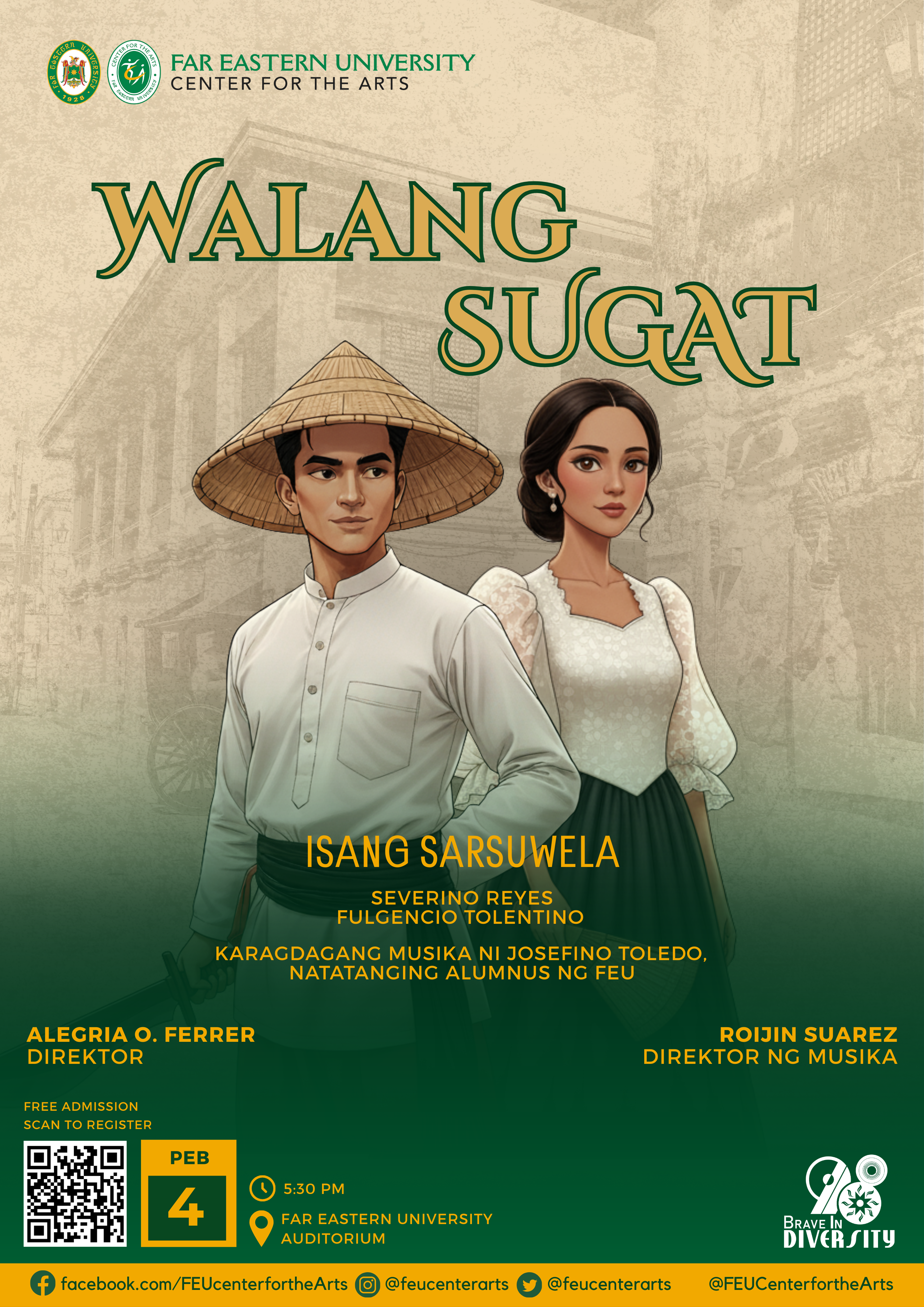 In celebration of Far Eastern University’s 98th founding anniversary, the FEU Center for the Arts (FCA) proudly presents WALANG SUGAT, a historic and more than century old sarswela written by Severino Reyes with music by Fulgencio Tolentino.